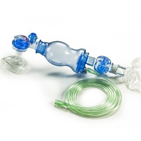 Resucitador manual neonatal desechable. Equipo que ayuda a restablecer la función de la ventilación por método no invasivo, en pacientes adultos. Bolsa de pvc. Autoinflable. Válvula de no reinhalacion de baja resistencia espiratoria. Reservorio de oxigeno con capacidad de 600 ml. Conexión para oxigenación suplementario. Conectores para el paciente. Volumen de la bolsa de 280 ml. Resistencias inspiratorias y espiratorias máximas en agua/litro/segundo. Con válvula de sobrepresión en vías aéreas de 40 cm h20, incluye mascarilla de pvc desechable neonatal.